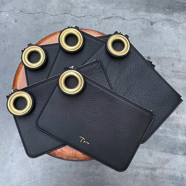 サイズ約 | 幅 20cm 高さ 13.5cm 色 | ブラック 素材 | ディアスキン(鹿革) 裏地 シャンタン黒 金具 |ファスナー(ゴールド)ハトメ(真鍮) ☆Brass Holderはオプションで有無選択ください。 鹿革のシンプルポーチ。 大きな真鍮ハトメの引き手が特徴で、引っ掛けたり、指にかけたりと持ち運びもラクラク。 オプションの Brass Holder を使えば、鞄にも簡単に取り付けられます。 お札入れや化粧ポーチなど、様々な用途にお使いいただけます。 革シボとは、革製品の表面に見られる独特の凹凸模様のことです。革の表面に現れるシワ模様を意味します。 ※天然皮革を使用し、一点一点手作りしている為、表記寸法や写真の色味と多少誤差がございます。 革は天然素材です。 動物が元々持っていた個性や表情をお楽しみ頂けると幸いです。 水濡れした場合、早めに乾いた柔らかい布で優しく拭き取り、陰干しして下さい。 水濡れするとシミ・色落ちすることがあります。 通気の悪い場所や乾いていない状態で保管しないで下さい。