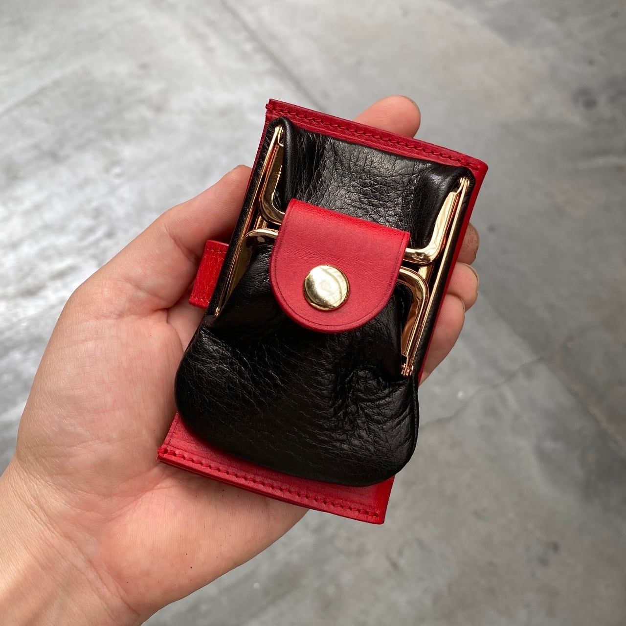 現在では作られていなかった観音開きの口金を復刻させた、シンプルで機能的なガマグチ小銭入れに、カード、名刺が束で入る仕様。