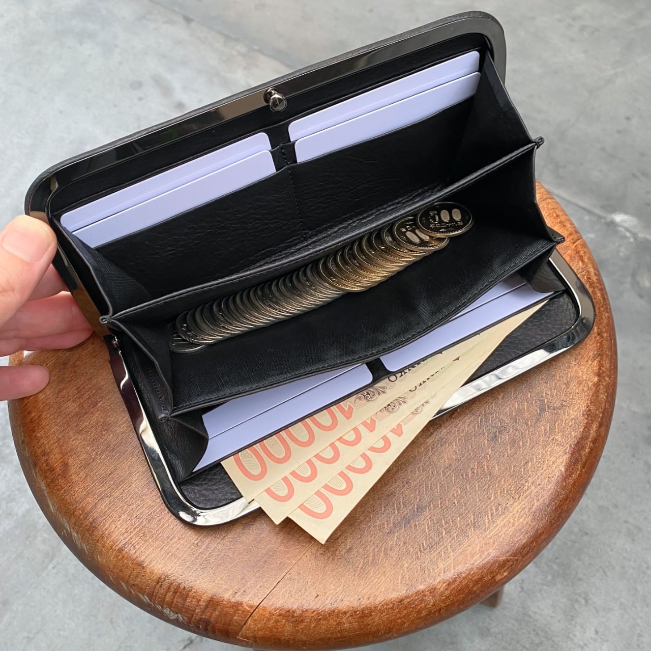 がま口上部(見えている金具箇所)に親指を置き、人差し指側面で金具突起箇所を押す事でガマ口が開きます。