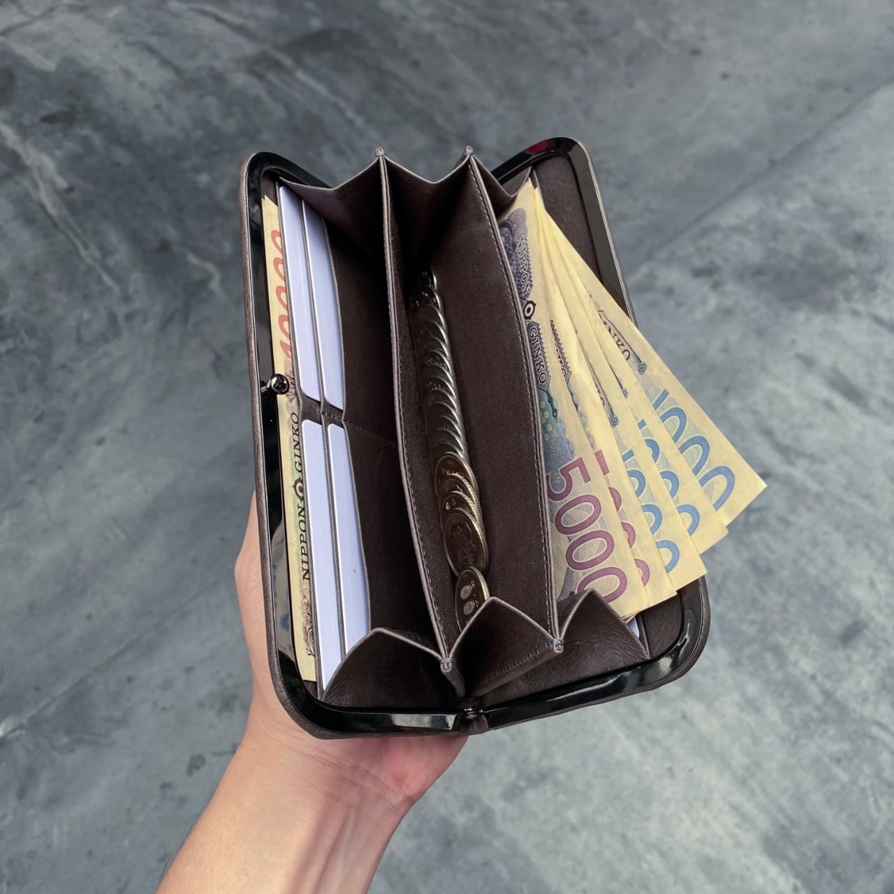 がま口上部(見えている金具箇所)に親指を置き、人差し指側面で金具突起箇所を押す事でガマ口が開きます。