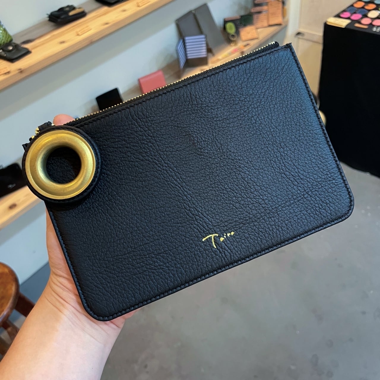 大きな真鍮ハトメの引き手が特徴で、引っ掛けたり、指にかけたりと持ち運びもラクラク。