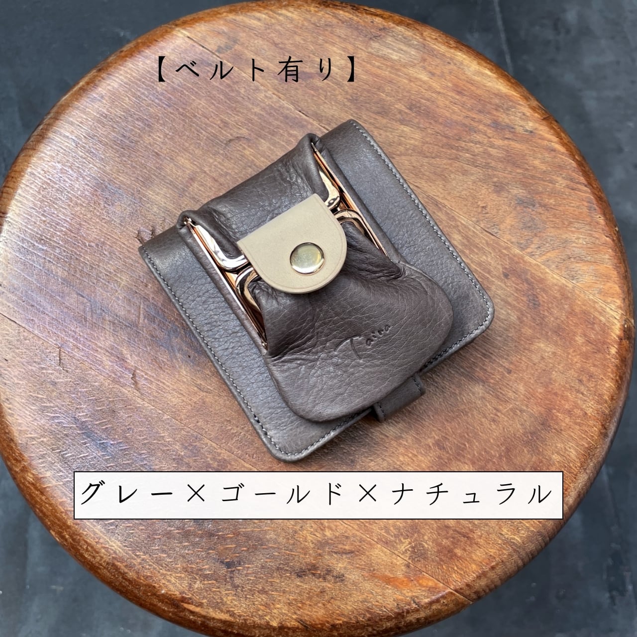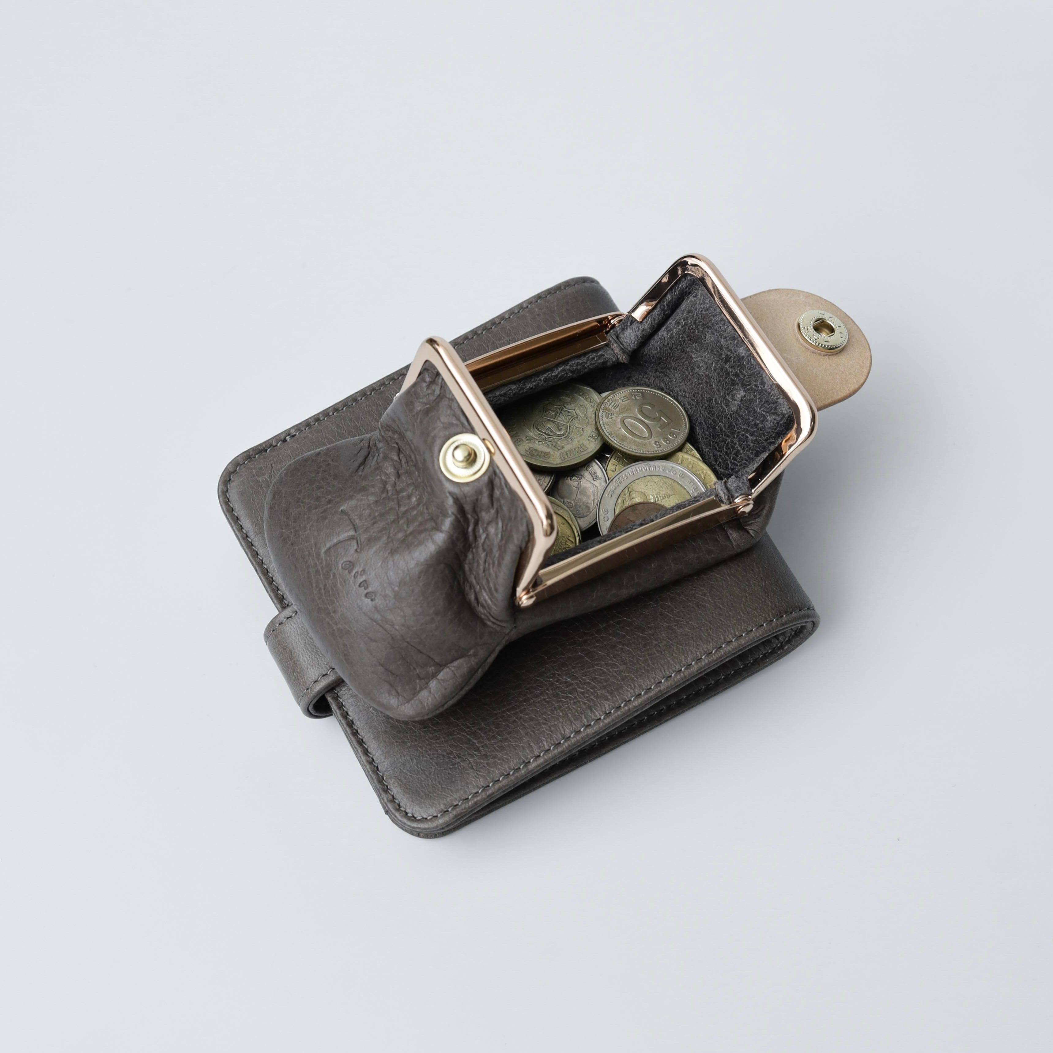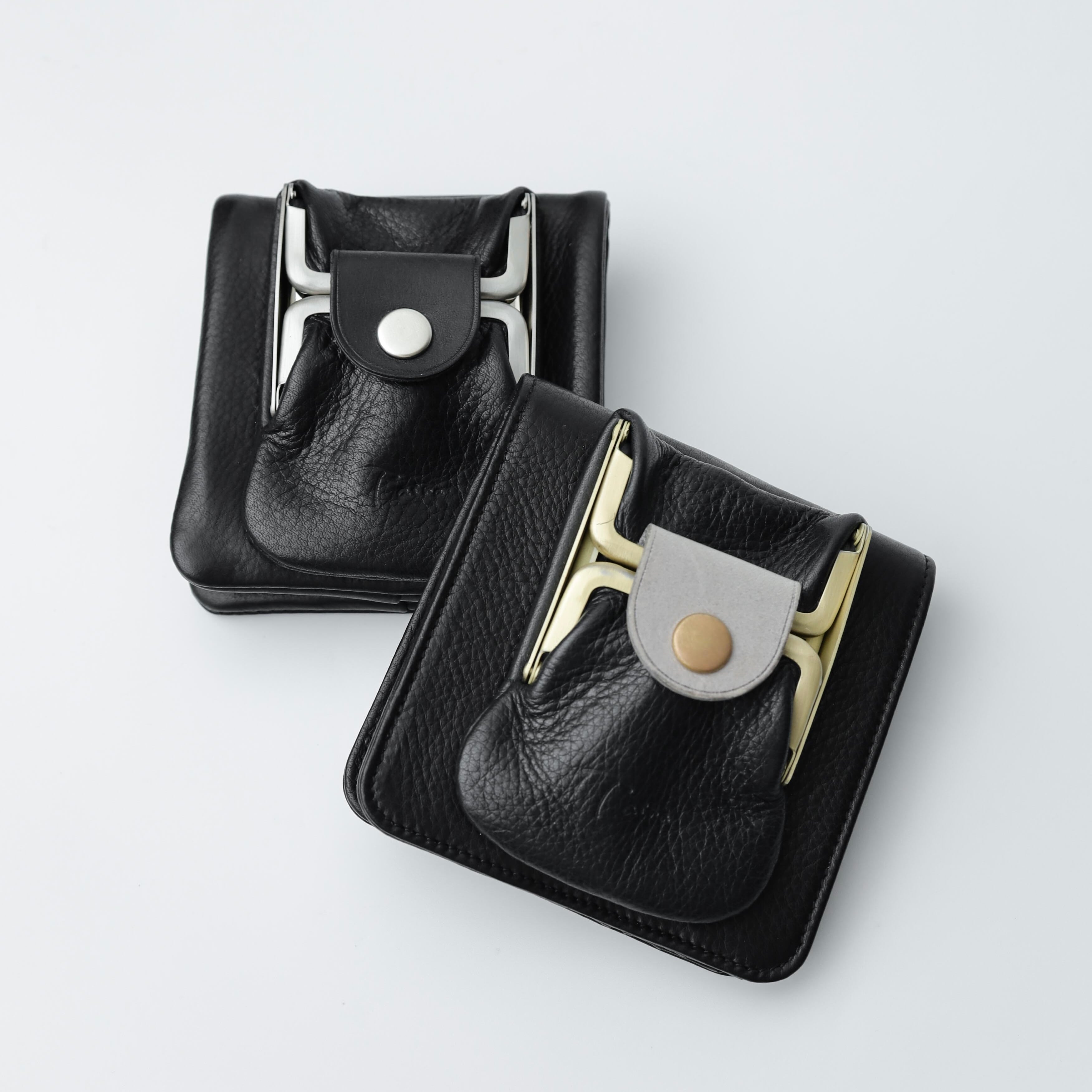 現在では作られていなかった観音開きの口金を復刻させたシンプルで機能的なガマグチ小銭入れに、二つ折り仕様のカード・お札入れを足した二つ折り財布。