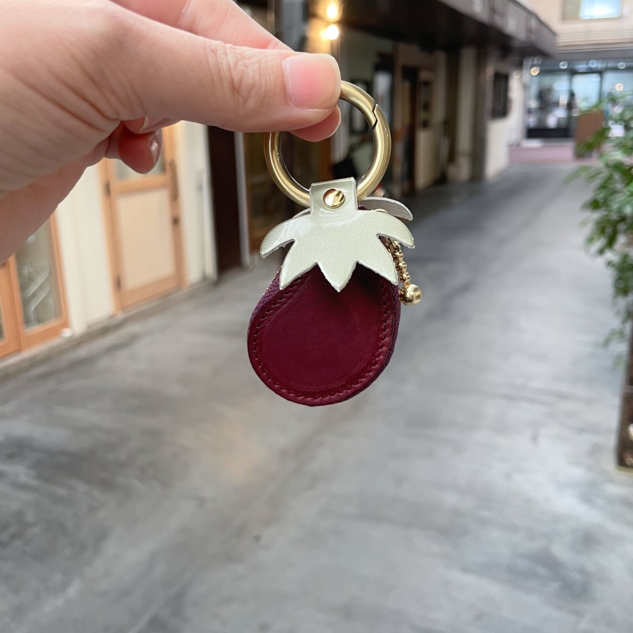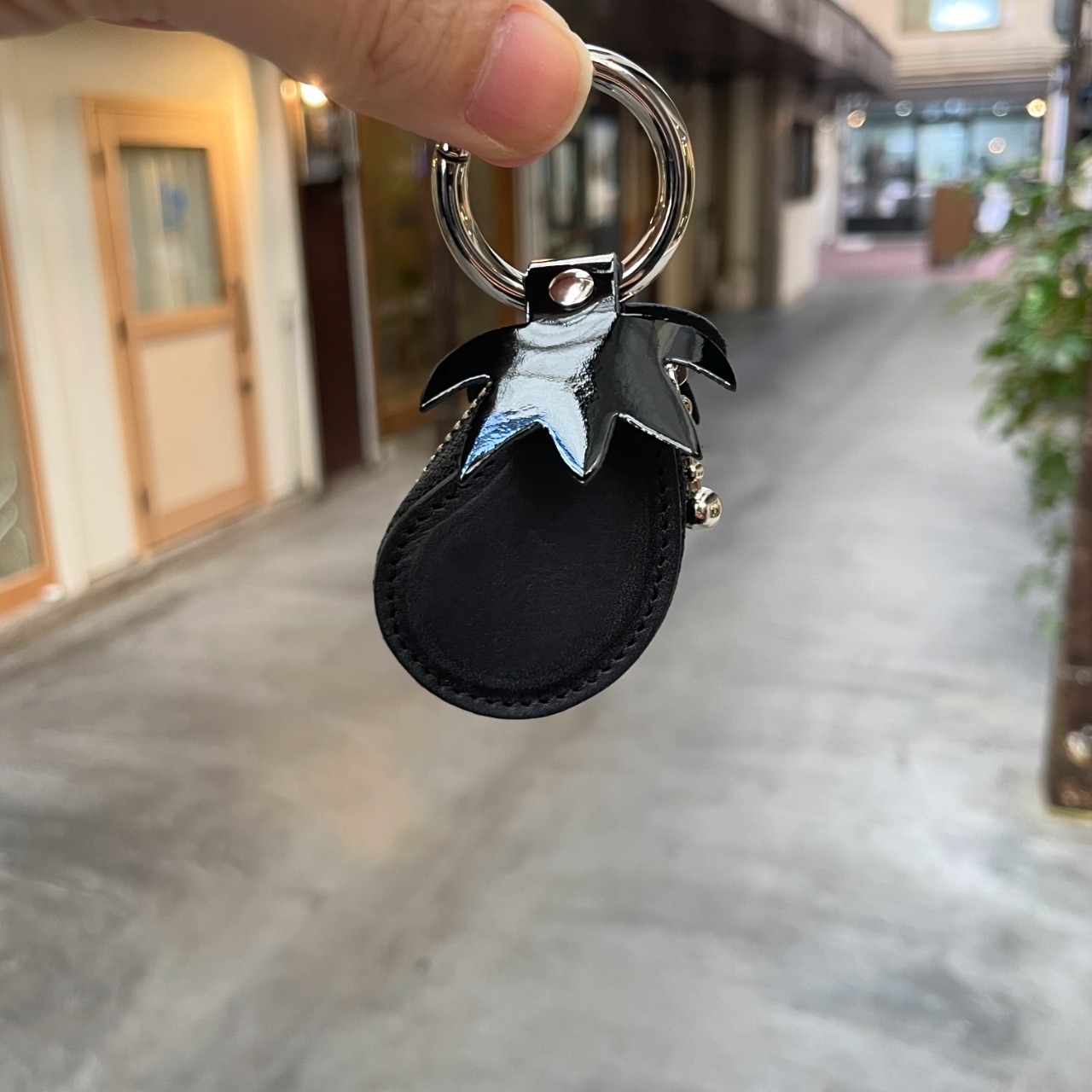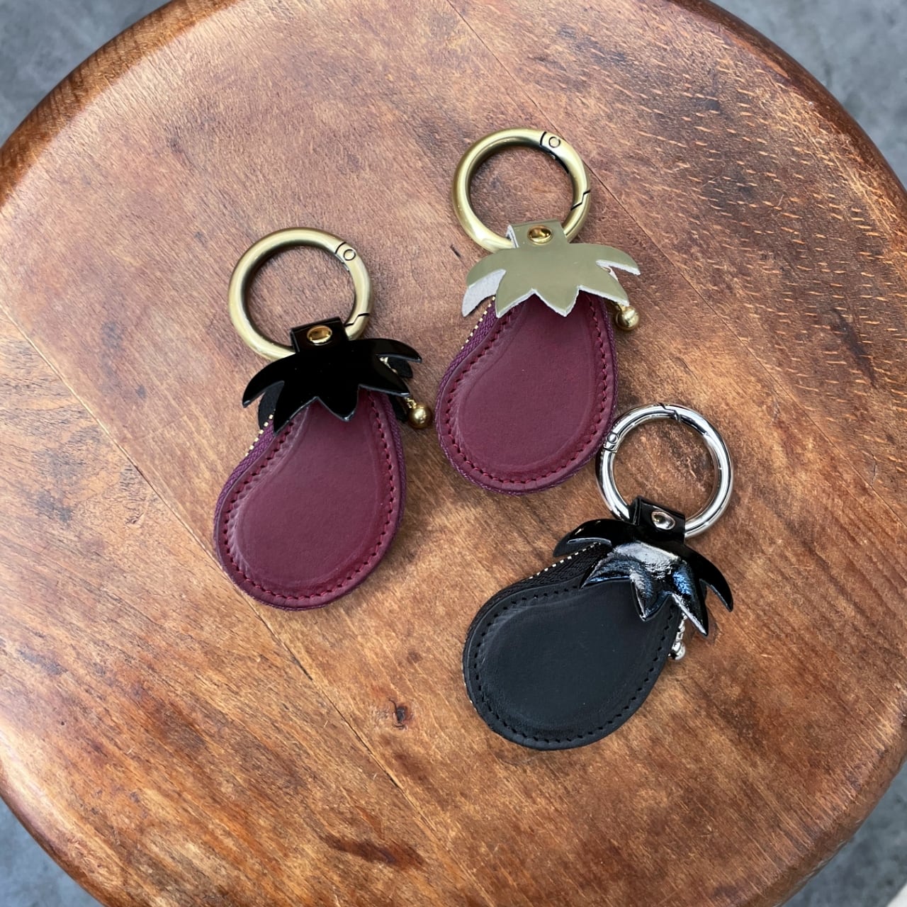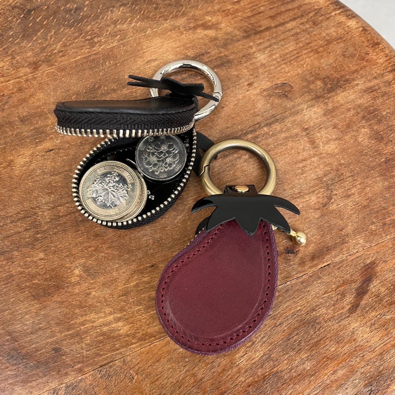 ユニークななすび型が特徴のレザーチャームケース!コインやくすり、小物入れとして大活躍します。イタリアンレザーとパテント革の巧妙な組み合わせが、上品さと遊び心を演出しています。