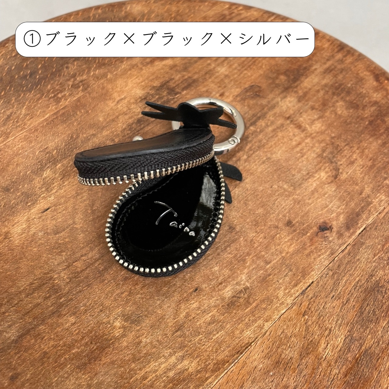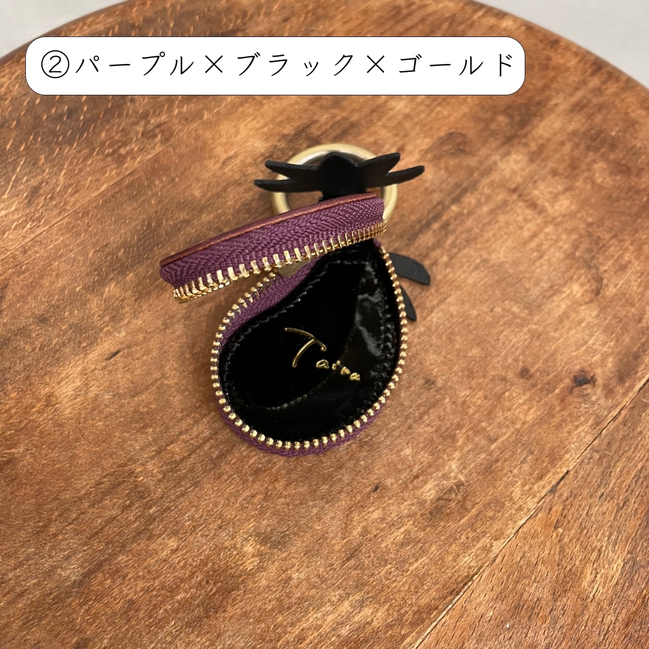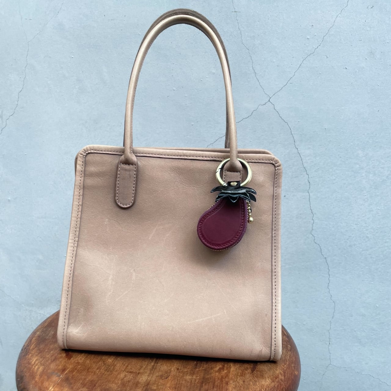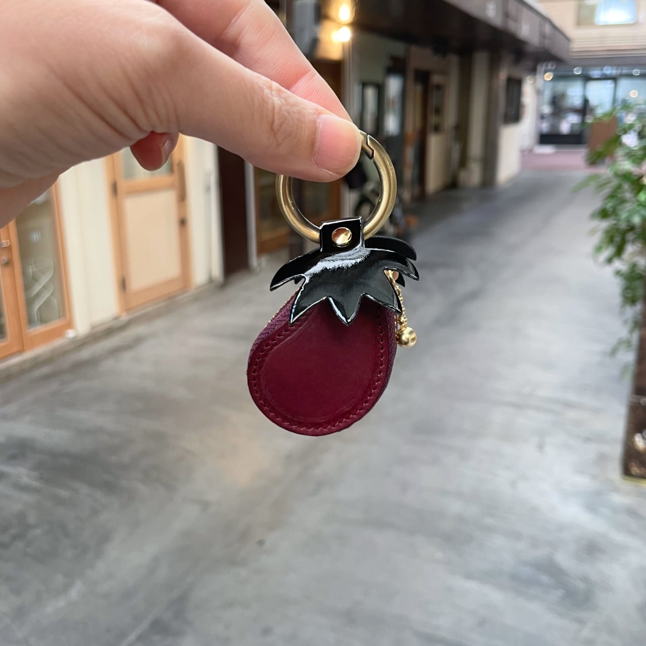 ユニークななすび型が特徴のレザーチャームケース!コインやくすり、小物入れとして大活躍します。イタリアンレザーとパテント革の巧妙な組み合わせが、上品さと遊び心を演出しています。