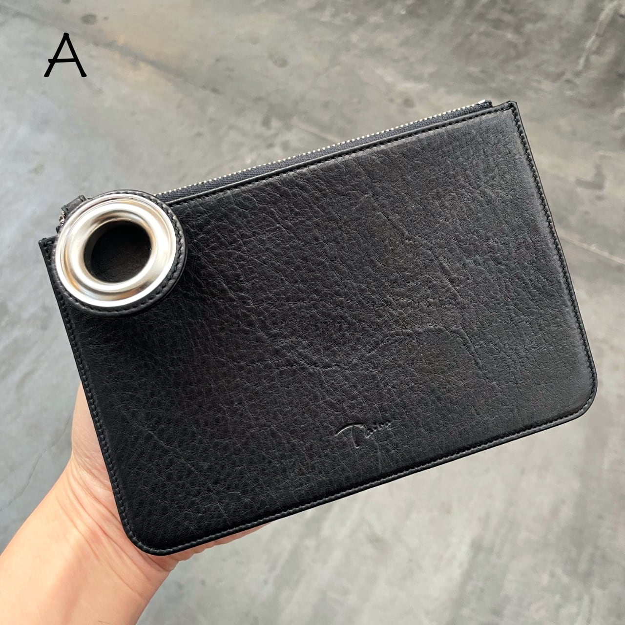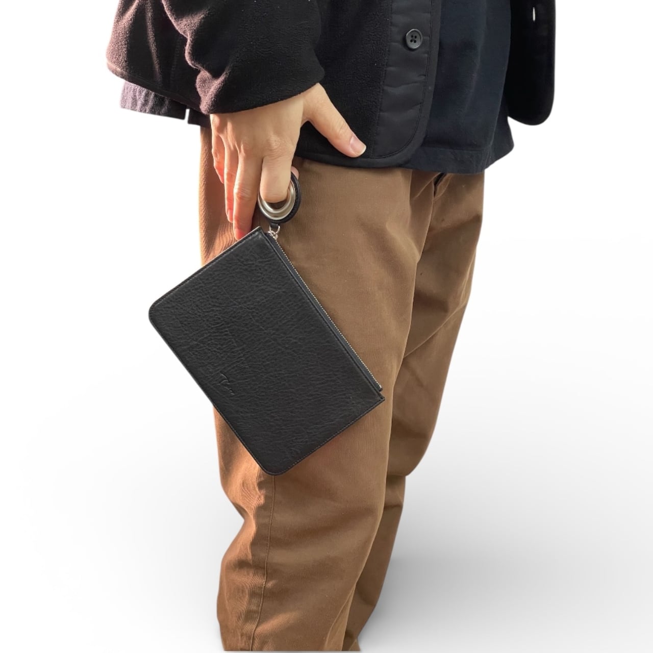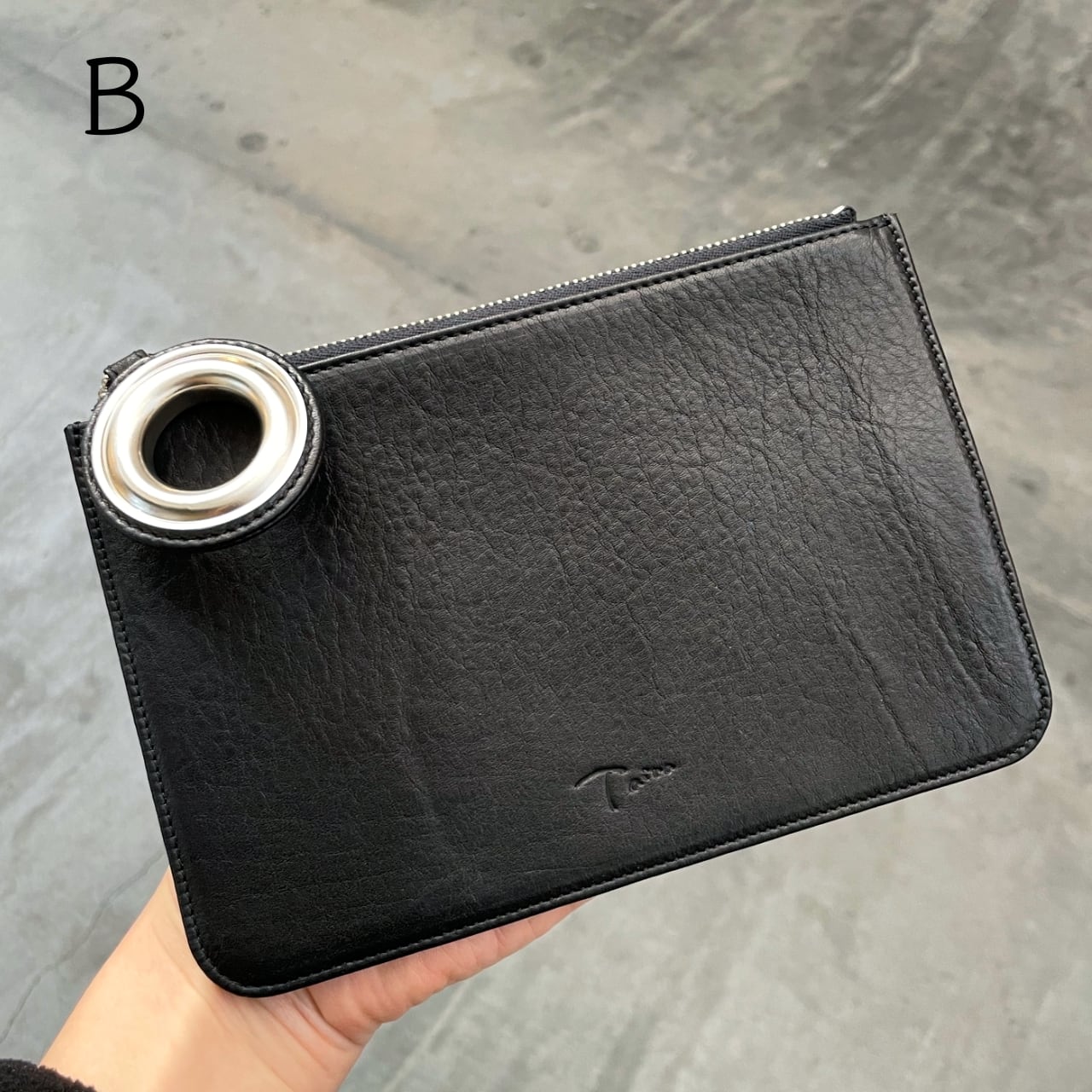 革本来の表情を楽しめる、自然なシボ感が魅力のアイレットポーチ。